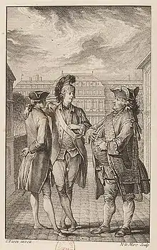 Dorat, à gauche, avec Pezay, en uniforme de dragon au centre. Gravure d’Eisen d’après Noël Le Mire.