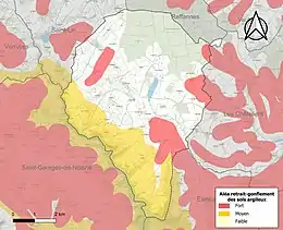 Les mouvements de terrains susceptibles de se produire sur la commune sont des tassements différentiels[17]. Le retrait-gonflement des sols argileux est susceptible d'engendrer des dommages importants aux bâtiments en cas d’alternance de périodes de sécheresse et de pluie[18]. 37,5 % de la superficie communale est en aléa moyen ou fort (54,9 % au niveau départemental et 48,5 % au niveau national)[Carte 2]. Depuis le , en application de la loi ELAN, différentes contraintes s'imposent aux vendeurs, maîtres d'ouvrages ou constructeurs de biens situés dans une zone classée en aléa moyen ou fort[Note 3],[19].