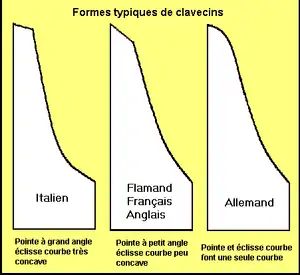 Les descriptions ci-dessous s'appliquent, avec de nombreuses variantes, aux clavecins historiques fabriqués au cours des XVIIe et XVIIIe siècles ainsi qu'aux instruments contemporains dont la facture s'en inspire. Les clavecins dits « modernes », fabriqués au début et pendant la première partie du XXe siècle peuvent avoir des caractéristiques assez différentes[3].