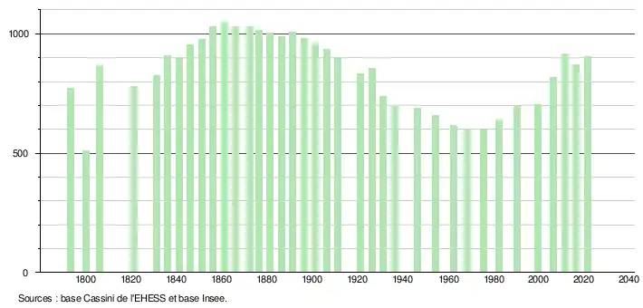 L'évolution du nombre d'habitants est connue à travers les recensements de la population effectués dans la commune depuis 1793. Pour les communes de moins de 10 000 habitants, une enquête de recensement portant sur toute la population est réalisée tous les cinq ans, les populations légales des années intermédiaires étant quant à elles estimées par interpolation ou extrapolation[22]. Pour la commune, le premier recensement exhaustif entrant dans le cadre du nouveau dispositif a été réalisé en 2006[23].