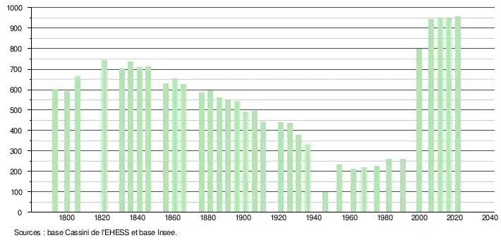 L'évolution du nombre d'habitants est connue à travers les recensements de la population effectués dans la commune depuis 1793. Pour les communes de moins de 10 000 habitants, une enquête de recensement portant sur toute la population est réalisée tous les cinq ans, les populations légales des années intermédiaires étant quant à elles estimées par interpolation ou extrapolation[32]. Pour la commune, le premier recensement exhaustif entrant dans le cadre du nouveau dispositif a été réalisé en 2006[33].
