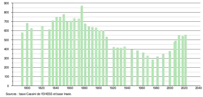 L'évolution du nombre d'habitants est connue à travers les recensements de la population effectués dans la commune depuis 1793. Pour les communes de moins de 10 000 habitants, une enquête de recensement portant sur toute la population est réalisée tous les cinq ans, les populations légales des années intermédiaires étant quant à elles estimées par interpolation ou extrapolation[16]. Pour la commune, le premier recensement exhaustif entrant dans le cadre du nouveau dispositif a été réalisé en 2007[17].
