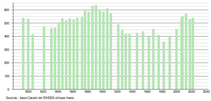 L'évolution du nombre d'habitants est connue à travers les recensements de la population effectués dans la commune depuis 1793. Pour les communes de moins de 10 000 habitants, une enquête de recensement portant sur toute la population est réalisée tous les cinq ans, les populations légales des années intermédiaires étant quant à elles estimées par interpolation ou extrapolation[21]. Pour la commune, le premier recensement exhaustif entrant dans le cadre du nouveau dispositif a été réalisé en 2007[22].