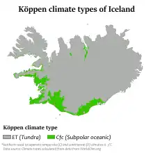 - (en) Cet article est partiellement ou en totalité issu de l’article de Wikipédia en anglais intitulé « Climate of Iceland » (voir la liste des auteurs).
