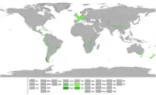 Carte du monde montrant les zones bénéficiant d'un climat océanique, les climats océaniques en pleine zone intertropicale sont des montagnes.