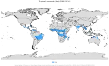 Le climat tropical de savane (ou climat tropical humide et sec[1],[2]) est un climat tropical caractérisé par une température moyenne supérieure à 18 °C pour tous les mois de l'année et une saison sèche bien distincte connaissant des précipitations inférieures à 60 mm. Le total annuel des précipitations est inférieur à l'équation Pann ≥ 25(100-Pmin)[note 1], qui définit le seuil avec le climat tropical de mousson[3],[4]. La classification de Köppen retient deux sortes de climats tropicaux de savane différents notés Aw et As. Aw correspond aux savanes à hiver sec et As aux savanes à été sec[3].