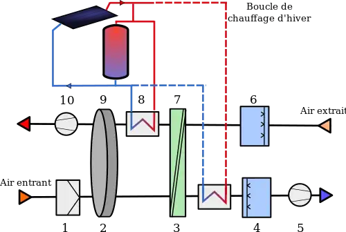- 3 - passage dans un échangeur de chaleur 3/7 : l'air entrant et sec revient à température de l'air extrait, lui-même refroidit au maximum (étape 6 de l'air sortant)