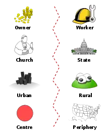 Un clivage de classe entraînant la formation de partis de gauche ou de droite. Il est parfois avancé qu'il s'agit en vérité d'un conflit entre riches et pauvres[1].