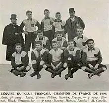 En 1896, le championnat change de formule et abandonne l'élimination directe. Ce championnat ayant débuté en janvier voit le triomphe du Club Français qui obtient une victoire 4-1[3] face aux White-Rovers le 23 février et ne quitte plus la tête du classement. En huit rencontres, le Club compte huit victoires et la défense clubiste n'encaisse que deux buts[d 13]. Dès le 15 mars[4] le Club est sacré champion de France. Ce résultat est d'autant plus impressionnant que tous les joueurs du Club français sont Français. L'équipe type du Club Français qui évolue alors en 2-3-5 est la suivante : Lucien Hutteau, dans les buts, Daumy et Lambert à l'arrière, Strittmatter, Block et Bernat au milieu de terrain, et Eugène Fraysse (capitaine), Georges Garnier, Gaston Peltier, Bruno et Laisné à l'avant[d 14]. Dans la foulée de ce titre, les Clubmen remportent le titre de champion des équipes réserves en n'alignant également que des victoires[5].