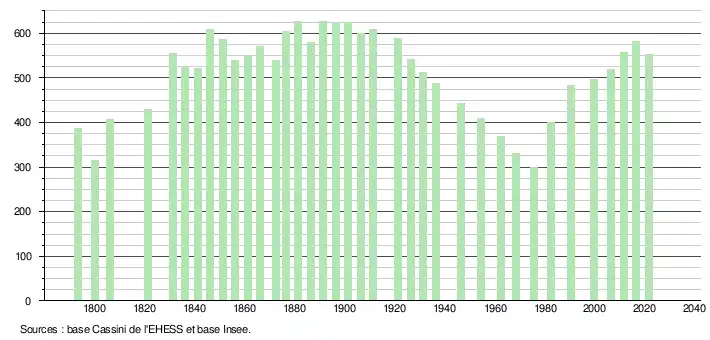 L'évolution du nombre d'habitants est connue à travers les recensements de la population effectués dans la commune depuis 1793. Pour les communes de moins de 10 000 habitants, une enquête de recensement portant sur toute la population est réalisée tous les cinq ans, les populations légales des années intermédiaires étant quant à elles estimées par interpolation ou extrapolation[19]. Pour la commune, le premier recensement exhaustif entrant dans le cadre du nouveau dispositif a été réalisé en 2006[20].