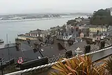 Cobh est situé sur la côte sud de Great Island dans le Cork Harbour, à environ 15 km au sud-est de la ville de Cork, duquel on observe le port.