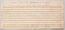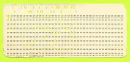 - Chaque perforation de chiffre 0 à 9 des cartes perforées précédentes devenait codée en décimal codé binaire (DCB/BCD), il s'agit des lignes de bits 1, 2, 4 et 8 sur la carte, offrant 10 valeurs.
