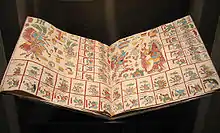- Les ouvrages rituels traitent de l'influence du calendrier sur la vie humaine. Les « tonalamatl » (= « livre des jours ») sont des almanachs divinatoires divisés selon les vingt périodes de treize jours qui constituaient le calendrier rituel de 260 jours appelé « tonalpohualli ». Ces ouvrages étaient consultés par les prêtres lorsqu'il fallait donner un nom à un nouveau-né, pour prédire son destin, fixer la date d'un mariage, partir en voyage ou lors de quelque autre évènement important. Les plus connus sont le Codex Borgia, le Codex Laud et le Codex Fejérváry-Mayer. On parle souvent de codex du groupe Borgia, car ils présentent tous des ressemblances avec le Codex Borgia. La plupart des spécialistes ne considèrent plus le célèbre Codex Borbonicus comme un codex préhispanique, mais comme un ouvrage réalisé en tout ou au moins en partie immédiatement après la conquête.