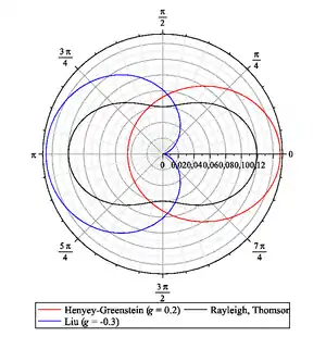 Cette distribution est généralement axisymétrique par rapport au rayon incident et ne dépend que de l'angle ( Ω , Ω' ) que l'on peut caractériser par son cosinus dont la valeur est donnée par le produit scalaire Ω . Ω'.