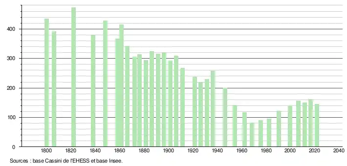 L'évolution du nombre d'habitants est connue à travers les recensements de la population effectués dans la commune depuis 1800. Pour les communes de moins de 10 000 habitants, une enquête de recensement portant sur toute la population est réalisée tous les cinq ans, les populations légales des années intermédiaires étant quant à elles estimées par interpolation ou extrapolation[15]. Pour la commune, le premier recensement exhaustif entrant dans le cadre du nouveau dispositif a été réalisé en 2006[16].