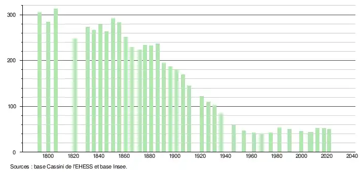 L'évolution du nombre d'habitants est connue à travers les recensements de la population effectués dans la commune depuis 1793. Pour les communes de moins de 10 000 habitants, une enquête de recensement portant sur toute la population est réalisée tous les cinq ans, les populations légales des années intermédiaires étant quant à elles estimées par interpolation ou extrapolation[14]. Pour la commune, le premier recensement exhaustif entrant dans le cadre du nouveau dispositif a été réalisé en 2007[15].