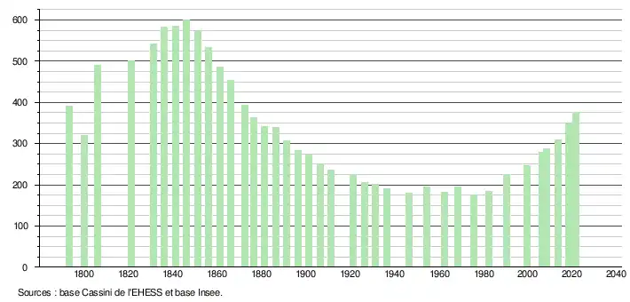 L'évolution du nombre d'habitants est connue à travers les recensements de la population effectués dans la commune depuis 1793. Pour les communes de moins de 10 000 habitants, une enquête de recensement portant sur toute la population est réalisée tous les cinq ans, les populations légales des années intermédiaires étant quant à elles estimées par interpolation ou extrapolation[30]. Pour la commune, le premier recensement exhaustif entrant dans le cadre du nouveau dispositif a été réalisé en 2008[31].