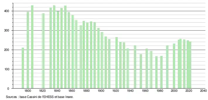 L'évolution du nombre d'habitants est connue à travers les recensements de la population effectués dans la commune depuis 1793. Pour les communes de moins de 10 000 habitants, une enquête de recensement portant sur toute la population est réalisée tous les cinq ans, les populations légales des années intermédiaires étant quant à elles estimées par interpolation ou extrapolation[23]. Pour la commune, le premier recensement exhaustif entrant dans le cadre du nouveau dispositif a été réalisé en 2008[24].