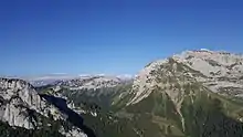 Vue aérienne depuis l'ouest de la Tournette (à droite) et du Lanfonnet (à gauche) avec entre les deux le col des Nantets.