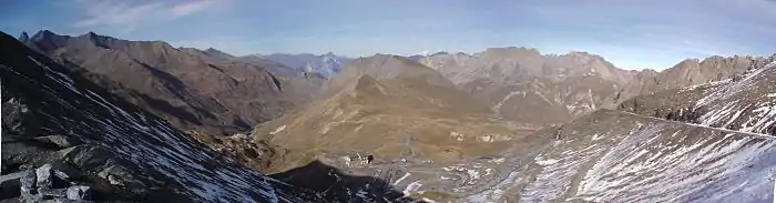 Vue du col avec le passage de la route (virage dans le quart en bas à droite de l'image) ; plus haut, le Grand Galibier (3 228 m).