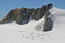 Vue depuis l'aiguille du Midi du col du Midi dominé par le mont Blanc du Tacul ; le refuge des Cosmiques est visible sur les rochers dans le bas de l'image. | ||||