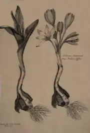Le colchique d’automne est une plante vivace, à bulbe[n 2] de la grosseur d’une noix, à tuniques noirâtres (Coste[10]). Ce genre d’organe de réserve, formé d’une tige enflée entourée d’écailles, est appelée corme. Le bulbe possède une face arrondie et une face plane creusée sur la ligne médiane d’une gouttière parcourue par la tige. D’odeur désagréable et de saveur âcre, il est formé de tuniques charnues et blanchâtres à l’intérieur (Hammiche et al[11], 2013). Chaque année le bulbe mère donne un à trois bulbes filles.