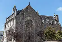 Toutefois le Grand Séminaire de Saint-Pol-de-Léon, fondé en 1680[22], qui formait et sélectionnait les étudiants entrant à l'Université de Paris, continue après 1763 de fonctionner dans le bâtiment que Mgr de la Bourdonnaye lui avait fait élever en 1708[23], aujourd'hui siège du lycée privé, 2 rue Cadiou. Depuis 1681, il accueille dans une annexe, actuel 4 rue Verderel, un collège non universitaire, l'École de Léon fondée en 1580[24] par Mgr de Neufville sous l'invocation de Kelou Mad au lieu-dit Prat Cuic[25], à la sortie ouest de la ville, et ouvert aux enfants de l'aristocratie ou de la bourgeoisie qui ne se destinent pas nécessairement à la prêtrise. L'enseignement des mathématiques y avait une place réservée.