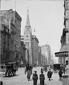 Le fantastique clocher de 215 pieds (65 mètres) imite les clochers de bois de la Nouvelle-Angleterre, avec une girouette en forme de coq, symbole traditionnel sur les églises du Vieux continent depuis le IXe siècle, rappelant le chant du coq après les trois reniements de l'apôtre Pierre lors de la Passion (Matthieu 26:34-75 ; Marc 14:30-14:72 ; Luc 22:34-61 ; Jean 13:38-18-27). La cloche a sonné le glas pour tous les présidents depuis Martin Van Buren en 1862. Une autre cloche, ramenée d'Amsterdam en 1795, est installée dans le petit cimetière de l'église, au coin de la Cinquième Avenue et de la 29e rue. Elle appartenait autrefois à l'église Old North de la rue Fulton[2].