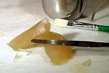 La colle de peau est fabriquée à partir de peau d'animal et est souvent utilisée dans le travail du bois. Elle peut être fournie sous forme de granulés, de flocons ou de feuilles plates, qui ont une durée de conservation indéfinie s'ils sont conservés au sec. Elle est dissoute dans l'eau, chauffée et appliquée à chaud, généralement autour de 60 °C (140 °F). Les températures plus chaudes détruisent rapidement la résistance de la colle de peau[6]. Des pots de colle commerciaux, de simples bains-marie peuvent être utilisés pour garder la colle chaude pendant son utilisation. Au fur et à mesure que la colle de peau refroidit, elle se gélifie rapidement. À température ambiante, la colle de peau préparée a la consistance d'une gélatine rigide, qui est en fait une composition similaire. La colle de peau gélifiée n'a pas de résistance significative, il est donc essentiel d'appliquer la colle, d'ajuster les pièces et de les maintenir stables avant que la température de la colle ne descende bien en dessous de 50 °C (120 °F).