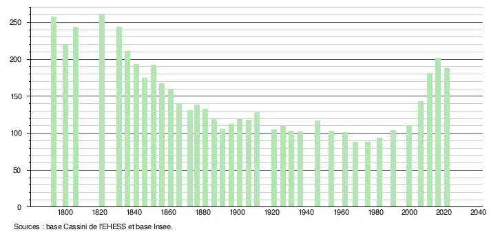 L'évolution du nombre d'habitants est connue à travers les recensements de la population effectués dans la commune depuis 1793. Pour les communes de moins de 10 000 habitants, une enquête de recensement portant sur toute la population est réalisée tous les cinq ans, les populations légales des années intermédiaires étant quant à elles estimées par interpolation ou extrapolation[19]. Pour la commune, le premier recensement exhaustif entrant dans le cadre du nouveau dispositif a été réalisé en 2006[20].