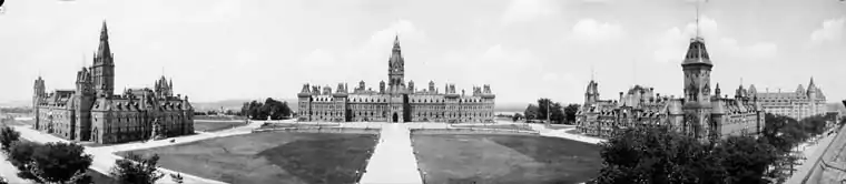 En 1855, la ville est renommée Ottawa et accède, en 1857 au statut de capitale de la province du Canada. La construction des édifices parlementaires autour d'une vaste esplanade (un immeuble pour le corps législatif au nord et deux édifices administratifs à l'est et à l'ouest) débute dès 1859 sur la colline, puis s'appelle la Colline du Parlement.