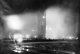 Tout au long de l'incendie, l'horloge de la Tour Victoria sonne les heures. À minuit, la cloche sonne onze fois, puis s'écrase au sol, tandis que les flammes gagnent le Sénat. Le lendemain, l'édifice central était en ruines, recouvert d'une épaisse couche de glace due aux vains efforts des pompiers.
