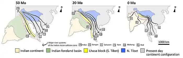 Avant la collision continentale, définie comme antérieure à 50 millions d'années selon le modèle de Brookfield, les systèmes fluviaux longitudinaux prédominaient sur le continent asiatique, où les principaux cours d'eau s'écoulaient parallèlement à la poussée régionale qui se rapprochait. Lors de la collision, datée de 20 millions d'années selon le modèle de Brookfield, la configuration des canaux fluviaux a été influencée par l'approche du continent indien. Bien que les principaux cours d'eau conservaient une direction parallèle au chevauchement, ils se sont courbés de part et d'autre du continent indien sous l'effet de la force de compression exercée sur le bassin versant. Cette modification est particulièrement visible dans le cas de l'Indus et du Gange. Alors que l'Indus, coulant vers l'ouest, contourne la limite ouest du chevauchement, le Gange, orienté vers l'est, contourne la limite est du chevauchement[41].