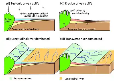 Lorsque le soulèvement est induit par l'érosion, les rivières transversales deviennent prédominantes dans la région au lieu des rivières longitudinales. Pendant une érosion active et un rebond isostatique, l'espace disponible diminue rapidement et continuellement, tandis que le taux de sédimentation augmente également. En conséquence, les rivières transversales issues des chaînes de montagnes surélevées peuvent s'étendre bien au-delà de leur base. Les rivières longitudinales ne dominent que dans les parties distales du bassin versant[40].