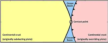 Le commencement d'une collision continentale est déterminé par n'importe quel point le long de la limite des plaques où la lithosphère océanique est complètement subductée, et où deux plaques continentales entrent en contact pour la première fois[4]. Dans le contexte de la collision Inde-Asie, elle serait caractérisée par le premier point où la croûte océanique de la Néotéthys disparaît, marquant le contact initial entre les continents de l'Inde et de l'Asie. Ce processus est déterminé par un point précis en raison de l'irrégularité de la forme des marges continentales. La subduction complète de la croûte océanique pourrait se produire de manière asynchrone le long du front de collision[5]. Différentes méthodes peuvent être utilisées pour estimer l'âge du début de la collision. Les preuves géologiques couramment utilisées incluent la stratigraphie, la sédimentologie et les données paléomagnétiques. La stratigraphie et la sédimentologie révèlent le transfert de matériaux d'un continent à un autre lors de la rencontre de deux continents, ainsi que les changements dans l'environnement de dépôt après la fermeture du bassin océanique et l'élimination complète de l'eau de mer[6]. Les données paléomagnétiques révèlent une collision lorsque les paléolatitudes des deux marges continentales se superposent[7].