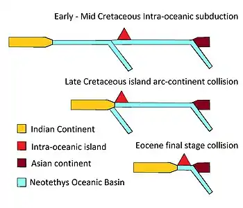 La collision arc-continent paléogène implique l'hypothèse que le continent indien a connu une collision en deux étapes[8]. La première étape consiste en la collision avec un arc insulaire intra-océanique dans l'océan Téthys, il y a environ 55 millions d'années (Ma)[8]. La seconde voit la collision entre le continent indien (avec l'arc insulaire) et le continent asiatique vers 33 Ma[8].