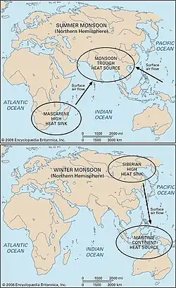 Le système des moussons d'Asie du Sud (en) affecte principalement les continents d’Asie du Sud et les plans d’eau environnants. Dans ce système particulier, la mousson estivale souffle en direction du littoral nord-est tandis que la mousson hivernale souffle en direction du large depuis l'ouest. La force motrice des systèmes de mousson est la différence de pression entre les masses terrestres et les masses d'eau. Cela est le plus souvent le résultat du chauffage différentiel de la terre et de la mer en raison de la différence de capacité thermique spécifique. Cependant, dans le cas du système de mousson d'Asie du Sud, le gradient de pression important est induit par l'Himalaya et le plateau tibétain. L'Himalaya constitue la plus haute chaîne de montagnes du monde. En été, la masse d'air à travers l'Asie du Sud se réchauffe en général. En revanche, la masse d'air au-dessus de l'Himalaya et du Tibet subit un refroidissement adiabatique et descend rapidement, formant une cellule de haute pression intense. Cette cellule est donc capable de faciliter le flux d'air vers la terre, soutenant ainsi la mousson estivale soufflant vers le littoral[43].