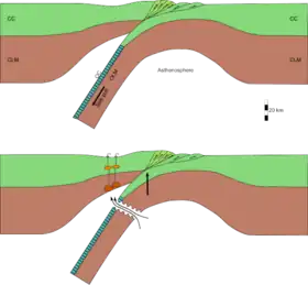L'hypothèse de collision diachrone implique des mécanismes à deux étapes de collision, dont la première étape commence entre le Paléocène et l'Éocène[8],[9].