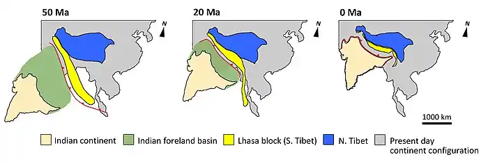 Bien que la chronologie précise de l'apparition des divers événements géologiques impliquant le plateau tibétain reste largement débattue, il existe un consensus général sur l'évolution de la configuration des blocs continentaux au fil du temps parmi les différentes propositions d'études. Royden et al. (2008)[39] a proposé un modèle de reconstitution tectonique pour illustrer comment les blocs continentaux du nord et du sud du Tibet ont évolué tout au long de la collision indo-asiatique.