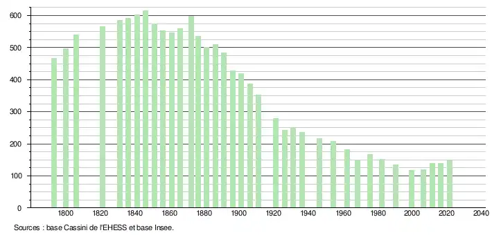 L'évolution du nombre d'habitants est connue à travers les recensements de la population effectués dans la commune depuis 1793. Pour les communes de moins de 10 000 habitants, une enquête de recensement portant sur toute la population est réalisée tous les cinq ans, les populations légales des années intermédiaires étant quant à elles estimées par interpolation ou extrapolation[16]. Pour la commune, le premier recensement exhaustif entrant dans le cadre du nouveau dispositif a été réalisé en 2006[17].