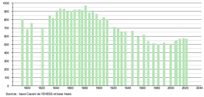L'évolution du nombre d'habitants est connue à travers les recensements de la population effectués dans la commune depuis 1793. Pour les communes de moins de 10 000 habitants, une enquête de recensement portant sur toute la population est réalisée tous les cinq ans, les populations légales des années intermédiaires étant quant à elles estimées par interpolation ou extrapolation[15]. Pour la commune, le premier recensement exhaustif entrant dans le cadre du nouveau dispositif a été réalisé en 2007[16].