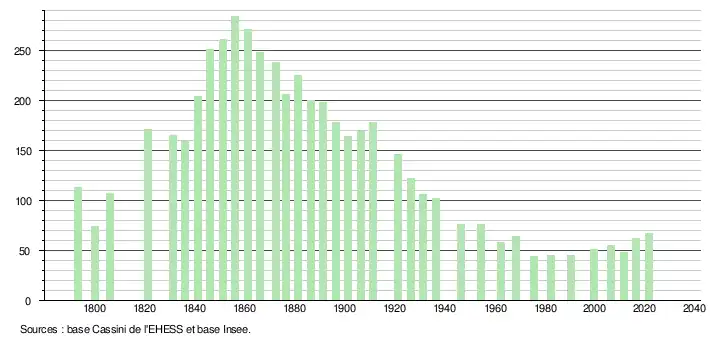 L'évolution du nombre d'habitants est connue à travers les recensements de la population effectués dans la commune depuis 1793. Pour les communes de moins de 10 000 habitants, une enquête de recensement portant sur toute la population est réalisée tous les cinq ans, les populations légales des années intermédiaires étant quant à elles estimées par interpolation ou extrapolation[13]. Pour la commune, le premier recensement exhaustif entrant dans le cadre du nouveau dispositif a été réalisé en 2006[14].