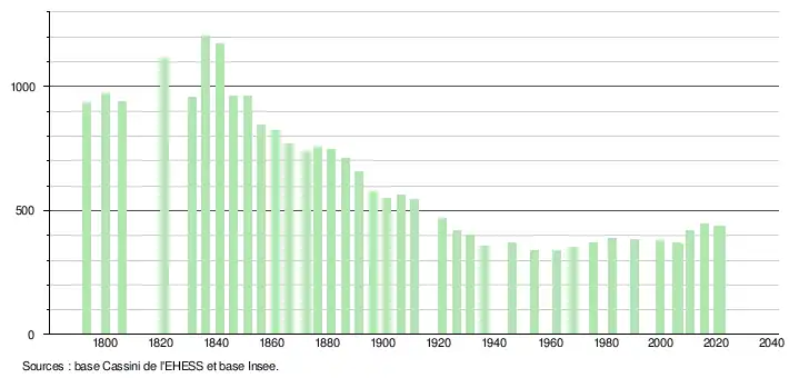 L'évolution du nombre d'habitants est connue à travers les recensements de la population effectués dans la commune depuis 1793. Pour les communes de moins de 10 000 habitants, une enquête de recensement portant sur toute la population est réalisée tous les cinq ans, les populations légales des années intermédiaires étant quant à elles estimées par interpolation ou extrapolation[22]. Pour la commune, le premier recensement exhaustif entrant dans le cadre du nouveau dispositif a été réalisé en 2005[23].