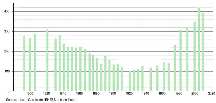 - Dans le tableau des recensements et le graphique, par convention dans Wikipédia, le principe a été retenu, pour les populations légales postérieures à 1999 de n’afficher dans le tableau des recensements et le graphique que les populations correspondant à l'année 2006, première population légale publiée calculée conformément aux concepts définis dans le décret no 2003-485 du 5 juin 2003, et les années correspondant à une enquête exhaustive de recensement pour les communes de moins de 10 000 habitants, ainsi que la dernière population légale publiée par l’Insee.