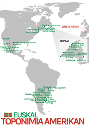 À Terre-Neuve-et-Labrador de nombreux toponymes côtiers ont une origine basque comme Portuchoa (Port-aux-Choix), Oportuportu (Port-au-Port), Aingura Charra (Ingornachoix Bay), Cadarrai (Codroy), Placencia (Placentia), d'autres sont une traduction du basque comme Sen Iango Irla (Île Saint-Jean[24]), Sen Iango Portua (Saint John Harbour), Baya ederra (Bonne Baie), Barbot Chillo (Barbace Cove) et plusieurs ont tout simplement changé de nom comme Granbaya (Détroit de Belle Isle), Tres Irlac (Bays of Islands), Sascot Portu (Port-aux-Basques), Oporporteco Barrachoa (Serpentine River)[25].