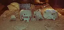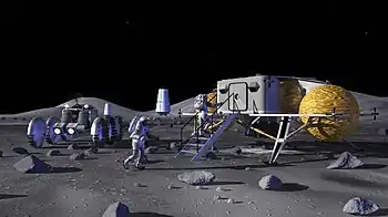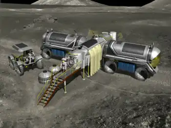 - Les bases lunaires AES[7] (Apollo Extension Systems), ALSS[8] (Apollo Logistics Support System) (1966), LEP[9] (Lunar Exploration Program) et LESA[10] (Lunar Exploration System for Apollo) (1968), devant réutiliser des éléments du programme Apollo comme le lanceur Saturn V, le vaisseau Apollo et le LEM (plus ou moins modifié) plus de nouveaux rovers et modules d'habitations semi-permanent pour deux à six astronautes, et devenir opérationnelle en mai 1970 pour des missions annuelles ou semestrielles (AES, ALSS), ou de 1969 à 1976 (LEP, LESA)[11] ;