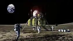 - La LOX-Augmented Nuclear Thermal Rocket (LANTR) Moon Base du Langley Research Center de la NASA, conçue par Stanley Borowski (1997), basée sur lanceur comprenant un moteur hybride oxygène liquide/nucléaire[15], un module d'atterrissage réutilisable Lunar Landing Vehicle (LLV) transportant de l'oxygène liquide (LOX) (le comburant) puisé dans le sol lunaire jusqu'à la navette spatiale LANTR, qui ramène de l'hydrogène liquide (LH2) (le carburant) de la Terre.