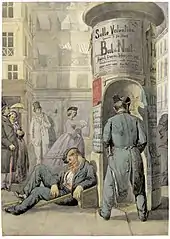 À Paris en 1839, le préfet de la Seine Gabriel Delessert autorise l'installation des « colonnes moresques » : l'affichage municipal est placardé sur un panneau de bois adossé à l'extérieur des urinoirs, édicules urbains installés par la ville[1]. Ces édicules sont améliorés sous Napoléon III par le Service des promenades et plantations dirigé depuis 1854 par l’ingénieur Adolphe Alphand qui perfectionne l'installation en isolant l'intérieur du regard par un écran et en éclairant l'intérieur avec un bec de gaz. La construction est redessinée par l'architecte en chef de ce service Gabriel Davioud, qui remplace la maçonnerie par une structure en fonte mais sa double fonction (affichage et urinoir) continue de provoquer des critiques, si bien que le comte Baciochi, ministre d’État et surintendant général des Théâtres, lance un concours pour trouver un nouveau support exclusivement réservé à l'affichage[2].