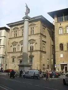 La consécration de cette colonne, érigée par Cosme Ier de Médicis, a changé plusieurs fois. Cosme l'avait prévu d'abord pour célébrer sa victoire de 1537 sur Sienne dans la Bataille de Montemurlo (d'autres citent la Bataille de Marciano). En 1569, le Pape Pie V avait accordé à Cosme le titre de Grand-Duc de Toscane, et la dédicace avait été faite à la justice avec la présente inscription[2].