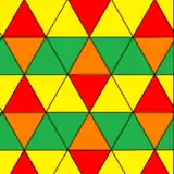 Par exemple, la coloration archimédienne d'un pavage triangulaire utilise deux couleurs (à gauche). Elle nécessite 4 couleurs pour devenir une coloration 2-uniforme (à droite) :